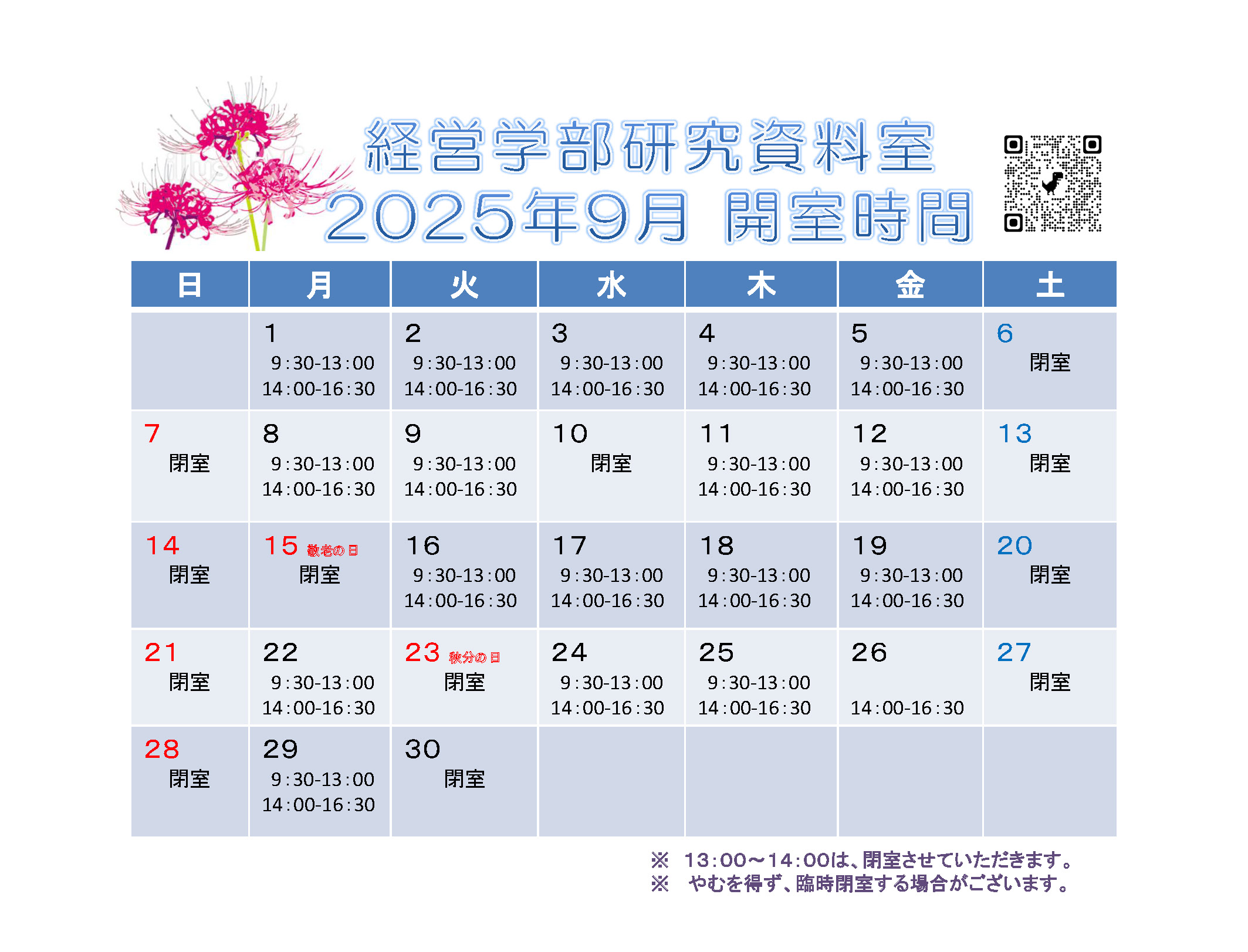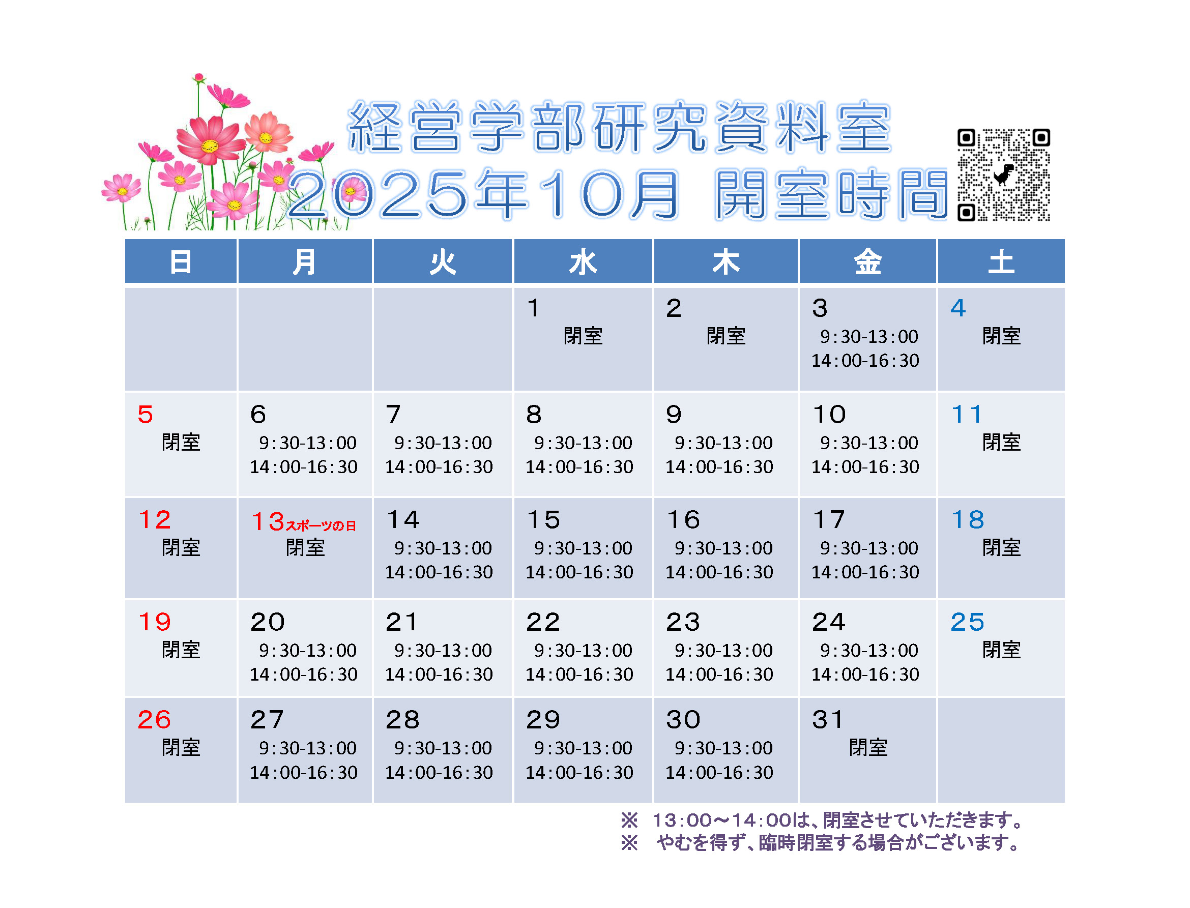 経営学部1号館(C棟、N3-4)。経営学務係のある建物、エレベータ前。今月の開室時間